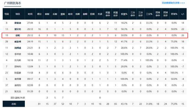 此番首秀,客战全华班的四川男篮,徐昕就是首发中锋,他打了25分钟12秒,结果呢,6投3中,1罚不中,拿下6分。别看得分不高,但是,人家在篮下的护筐能力突出啊,此役拿下了13个篮板球,成为全场抢到最多篮板球的那个人。
