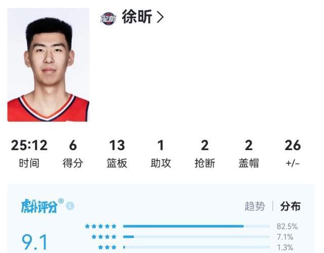 不但能护筐,徐昕还送出了一记助攻,2次抢断,2次盖帽,另有1失误2犯规,正负值+26,全队第一。如此勇猛的徐昕,真是叫人刮目相看了。