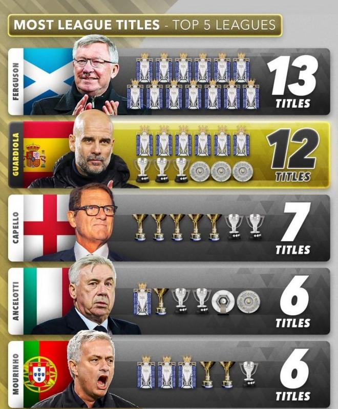 排在第3位的是足坛传奇教头卡佩罗,在其执教生涯当中一共获得过7座联赛冠军奖杯。其中包括5座意甲冠军以及两座西甲冠军。从数据方面不难看出,弗格森以及瓜迪奥拉这两人是断层领先于足坛其他主教练的,这也证明大部分主帅带队的稳定性远不如榜单前2。毕竟能够在漫长的赛季当中保持球队稳定获取积分,这本身就是一种统治力的体现。而卡佩罗能够排在第三,也是相当不容易。